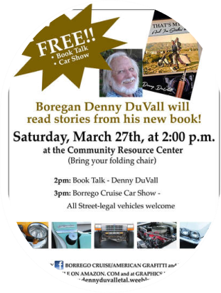 Denny DuVall’s engaging first book is a must-read for all Borregans, copies available via “Graphics You Can Trust” in the Mall, Amazon online, and other outlets where important local literature is offered for sale.